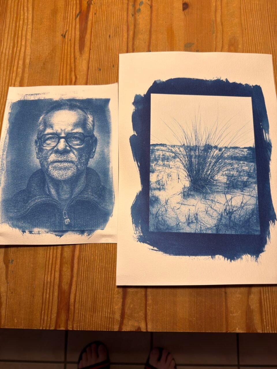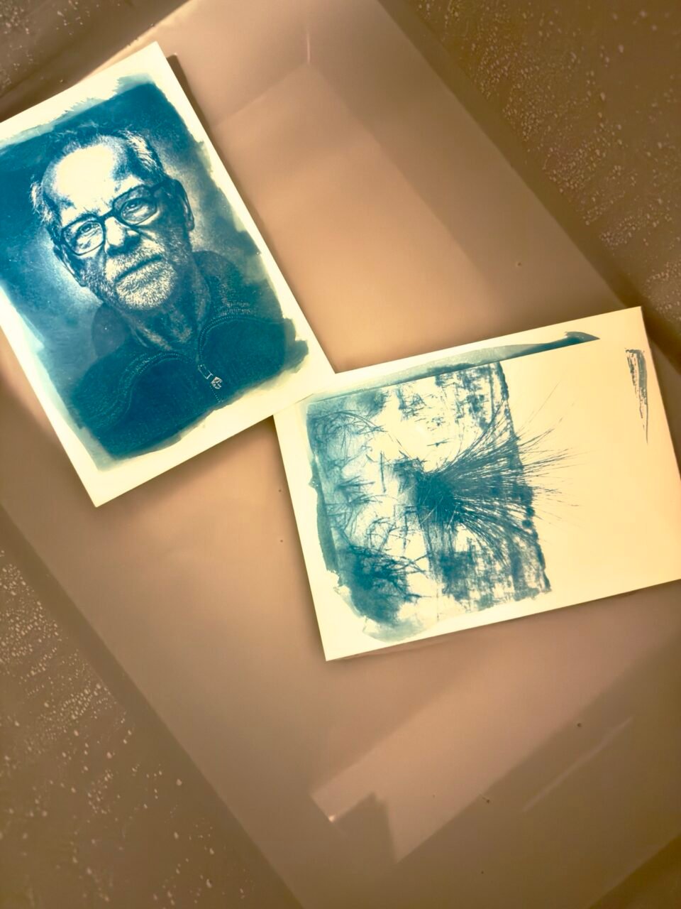 Nach der Belichtung wird das Papier gründlich gewässert, damit die unbelichtete Chemie ausgewaschen wird. Sobald alles getrocknet ist, entsteht der typische tiefblaue Cyanotypie-Druck. Man kann die Bilder später sogar noch umfärben, aber das hebe ich mir für später auf.
