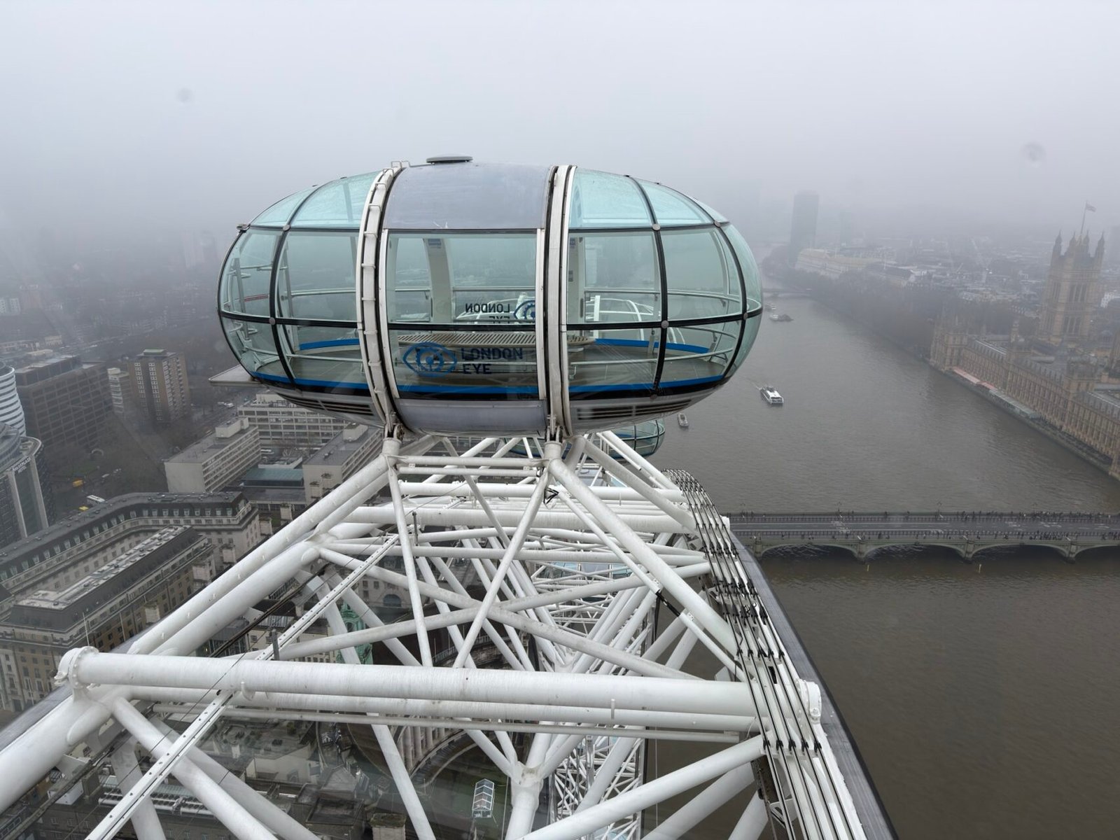 Am darauffolgenden Tag zeigte sich London wieder von seiner typischen Seite: regnerisch und diesig. Entsprechend hat sich die Fahrt mit dem London Eye aus meiner Sicht nicht wirklich gelohnt. Neben den Regentropfen auf den Scheiben waren auch hier deutliche Reflexionen ein Problem. Für eine einzige Umdrehung von etwa 20 Minuten ist der Preis von 30 bis 60 Euro – je nach Ticket – zudem recht happig.